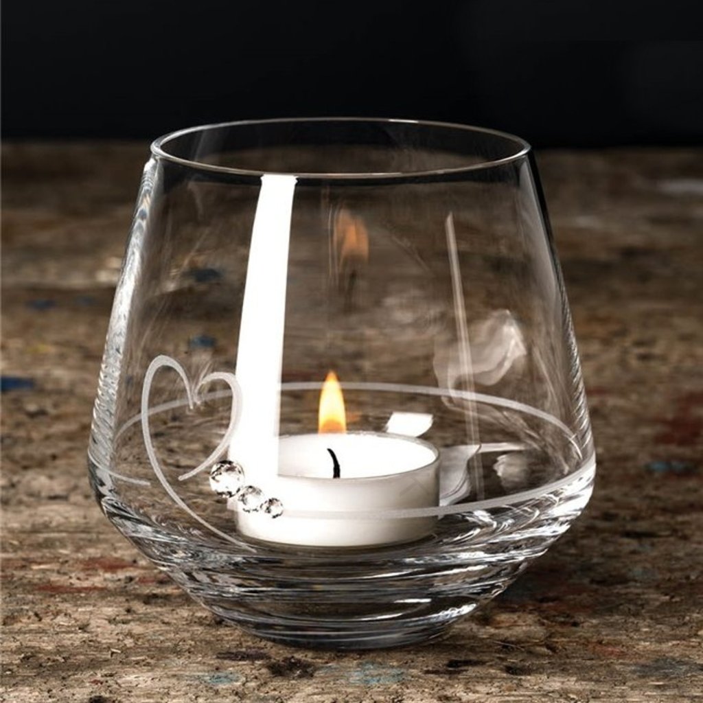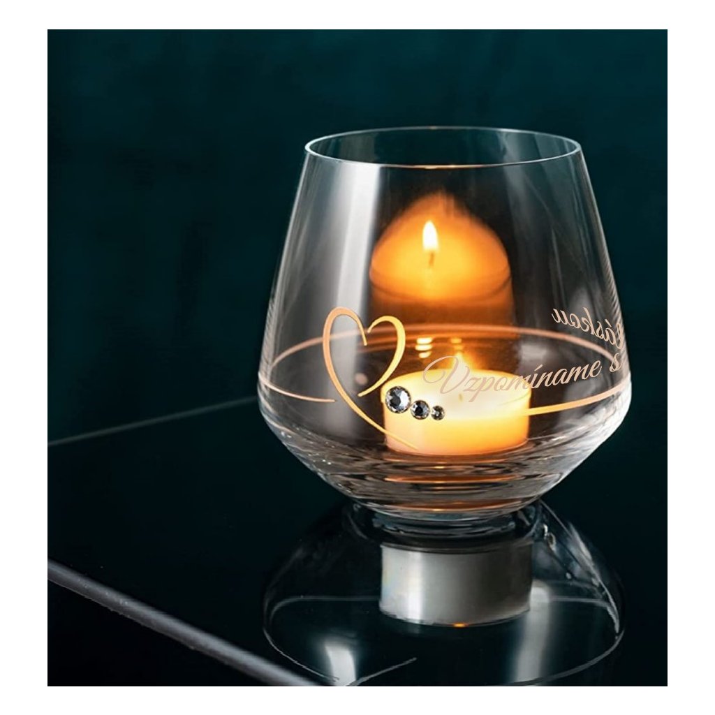 Sklenený krištáľový svietnik je zdobený originálnymi kamienkami Swarovski. Sviečka sa dodáva s 1 čajovou sviečkou.