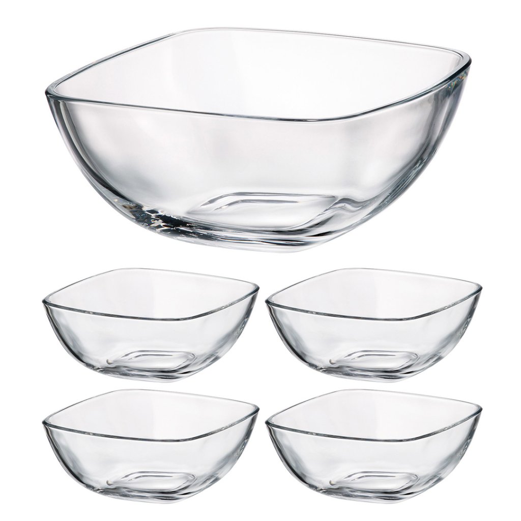 Súprava obsahuje 1 misku s priemerom 29 cm a 4 misky s priemerom 18 cm. Vyrobené v Českej republike z krištáľového skla Crystalite Bohemia.