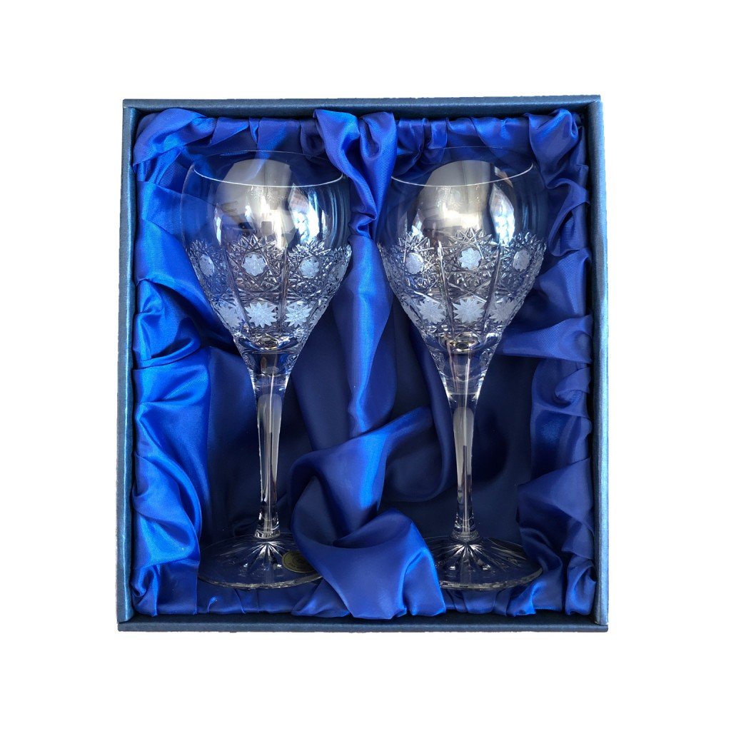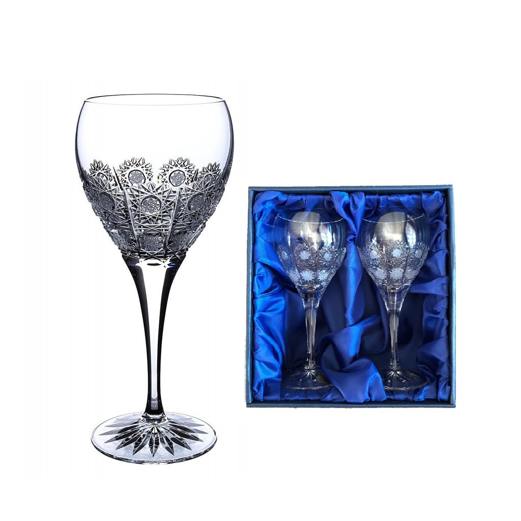 Sada 2 krištáľových pohárov na biele víno zdobených ručne brúseným tradičným dekorom 500pk. Dodáva sa v darčekovej škatuľke so saténovou výplňou.