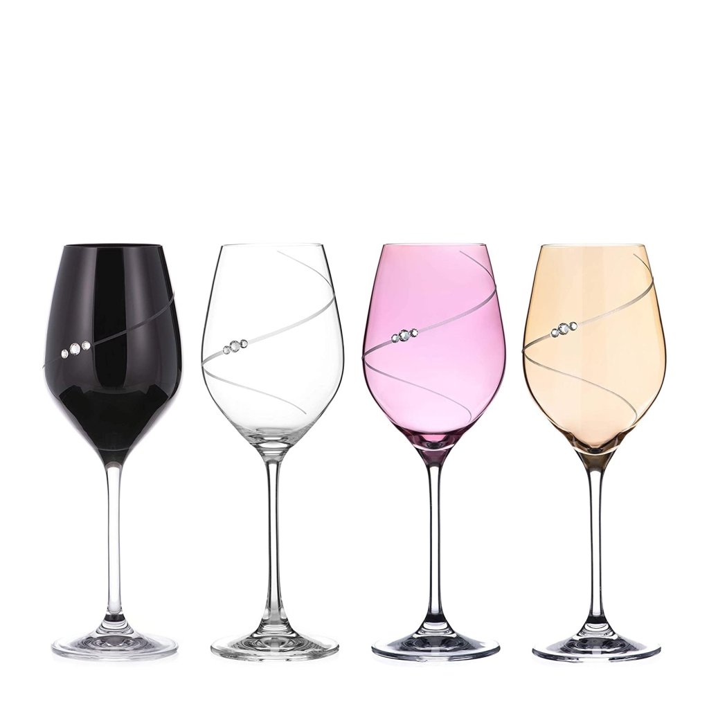 Súprava krištáľových pohárov na biele víno s pravými kryštálmi Swarovski. Balenie obsahuje 3 farebné a 1 číry pohár.