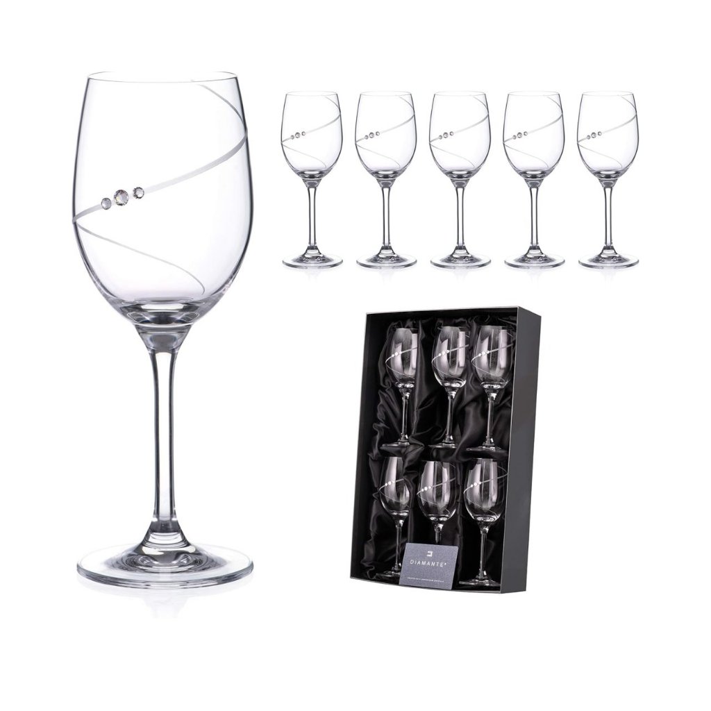 Súprava 6 krištáľových pohárov na červené víno zdobených originálnymi kryštálmi Swarovski. Poháre sa dodávajú v darčekovej krabičke so saténovou výplňou. Vhodné ako darček.
