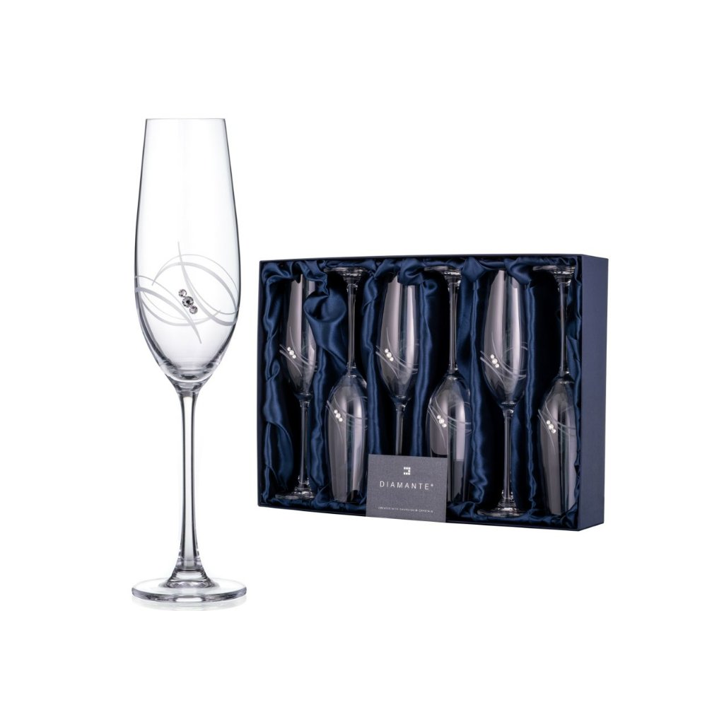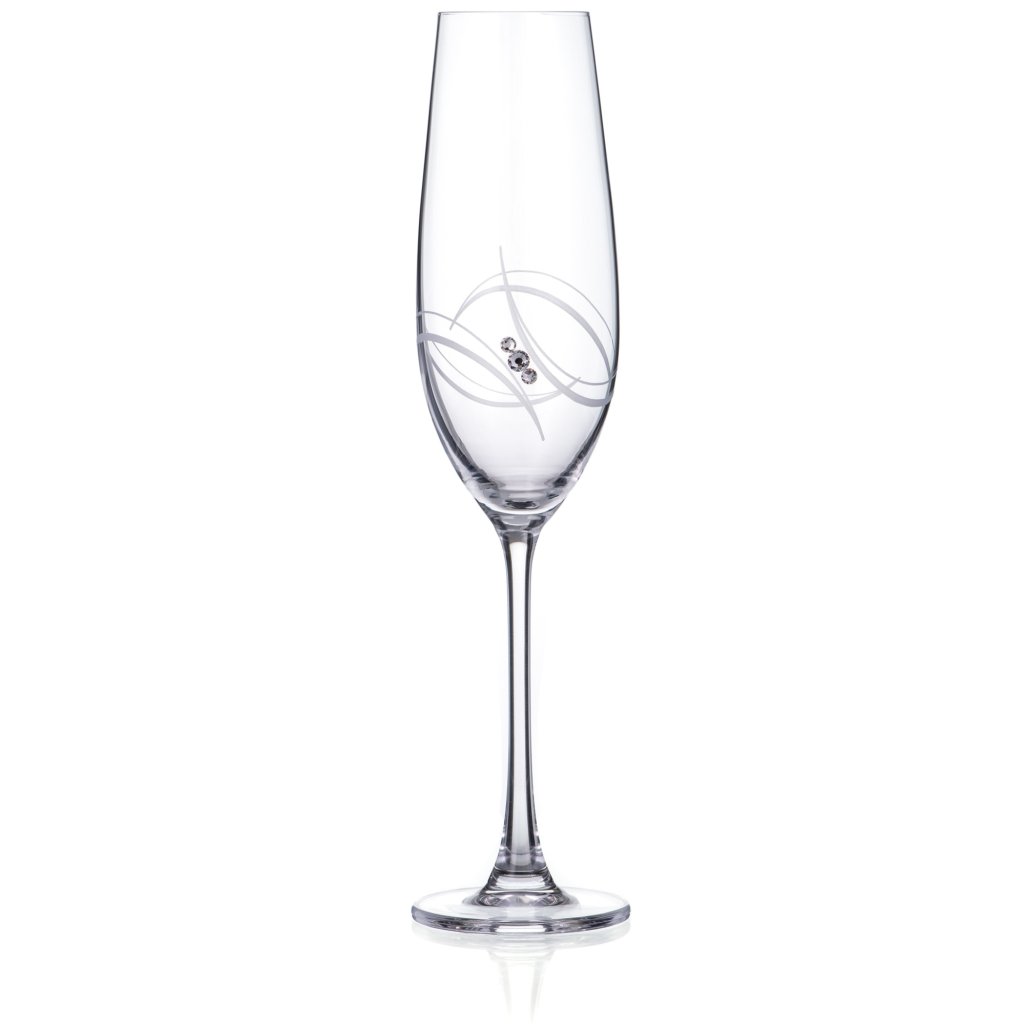 Sada 6 krištáľových pohárov na šampanské s originálnymi kameňmi Swarovski. Dodáva sa v saténovej darčekovej krabičke.