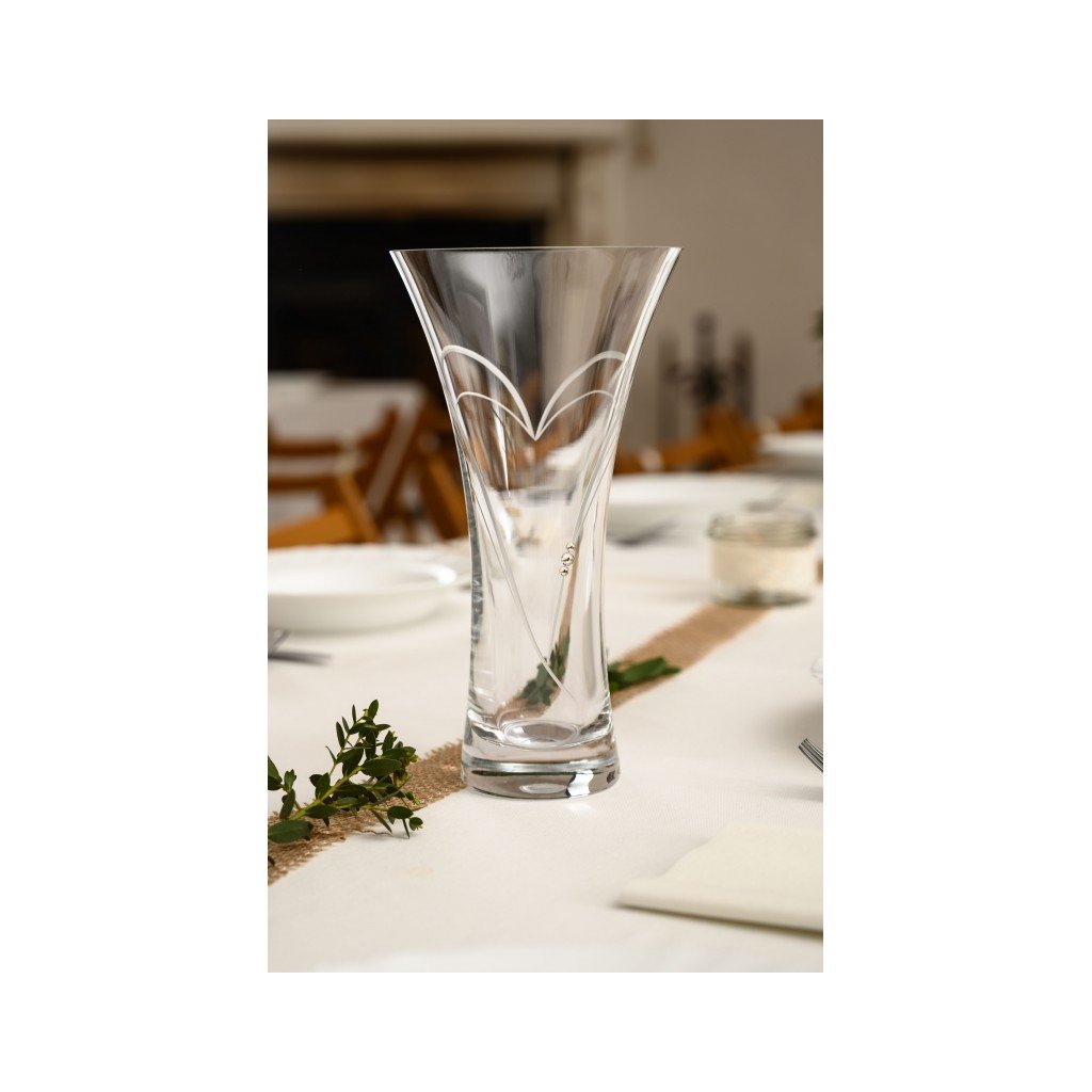 Krištáľová váza s vyrezávaným motívom srdca je zdobená originálnymi kameňmi Swarovski. Dodáva sa v darčekovej škatuľke.