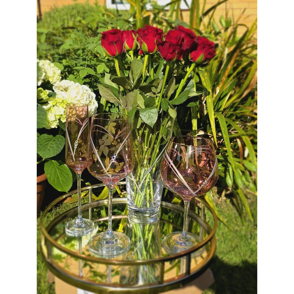 Sklenená váza má dekor v tvare srdca a je zdobená originálnymi kameňmi Swarovski. Dodáva sa v darčekovej škatuľke.